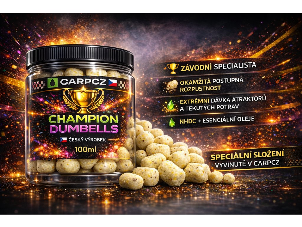 Champion Dumbells – speciální edice závodních nástrah Champion Dumbells CarpCZ představují prémiovou závodní edici nástrah, vytvořenou na základě dlouhodobého testování při reálných závodech i intenzivním rybolovu. Každý detail – tvar, struktura, vyvážení i chuťový profil – je navržen s jediným cílem: donutit rybu ke záběru rychleji než konkurence. Díky specifickému dumbells tvaru nástraha přirozeně pracuje u dna i nad ním, je snadno nasátelná a zároveň selektivnější než klasické kulaté nástrahy. ⸻ Čím jsou Champion Dumbells výjimečné •