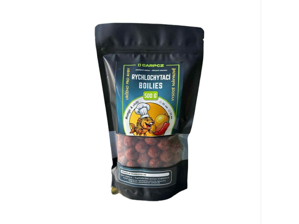Rychlochytací boilies CARPCZ jsou speciálně vyvinuté boilies s okamžitým účinkem, určené pro situace, kdy je potřeba rychle přimět ryby k záběru. Jsme český výrobce rybářských nástrah a naše rychlochytací boilies vznikají na základě vlastního vývoje a dlouhodobého testování u vody. Díky svému složení, jemnější struktuře a vysokému obsahu atraktivních složek se rychlochytací boilies okamžitě uvolňují ve vodě a vytvářejí silný pachový i chuťový signál v okolí nástrahy.